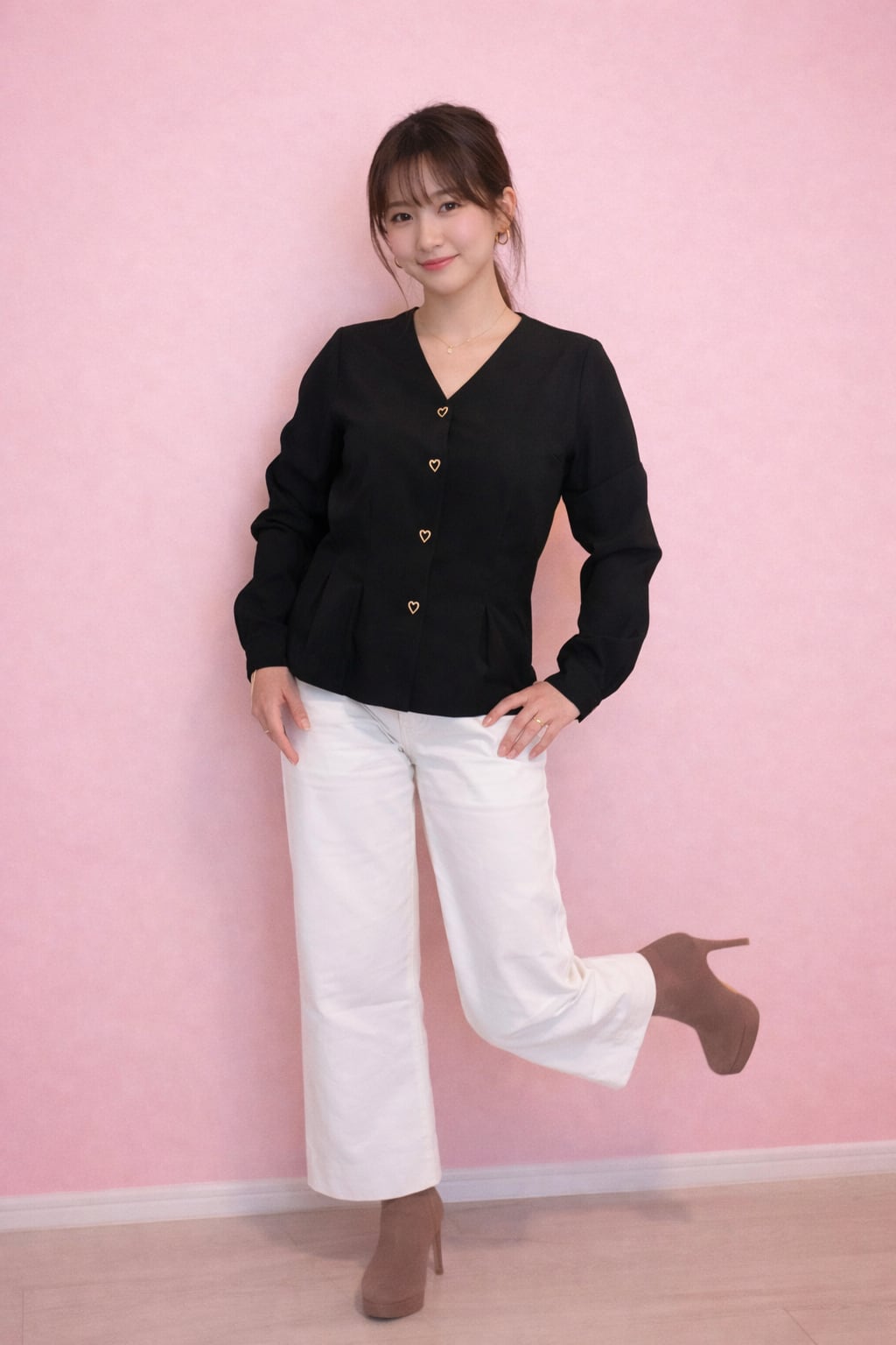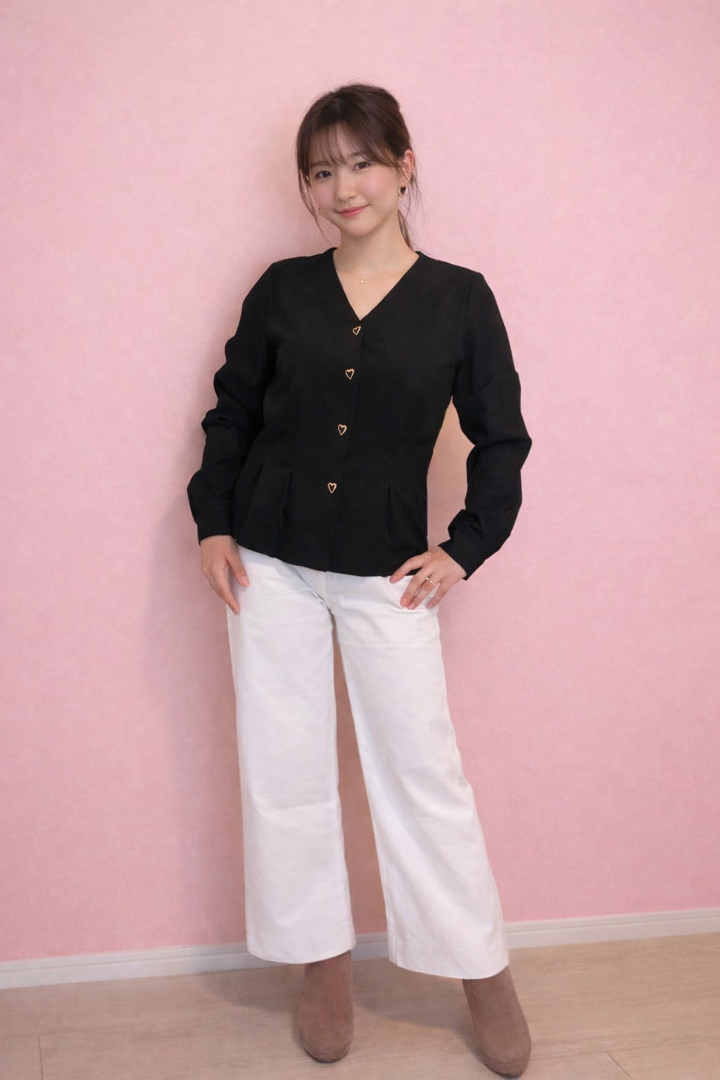 トップスはウエスト位置を高く見せてくれるペプラムデザイン。